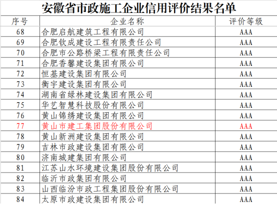 近日,安徽省市政工程協(xié)會(huì)正式發(fā)布《關(guān)于公布2025年安徽省市政施工企業(yè)信用評(píng)價(jià)結(jié)果的通知》。黃山市建工集團(tuán)憑借卓越的綜合實(shí)力、規(guī)范的市場(chǎng)行為、優(yōu)良的工程品質(zhì)及堅(jiān)實(shí)的信用體系建設(shè),成功獲評(píng)最高信用等級(jí)——AAA級(jí)。標(biāo)志著集團(tuán)在誠(chéng)信經(jīng)營(yíng)、履約能力與社會(huì)責(zé)任履行方面獲得了行業(yè)主管部門與協(xié)會(huì)的高度認(rèn)可,是企業(yè)信用建設(shè)領(lǐng)域的又一重要里程碑。