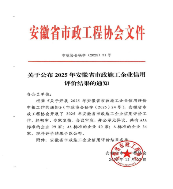 近日,安徽省市政工程協(xié)會(huì)正式發(fā)布《關(guān)于公布2025年安徽省市政施工企業(yè)信用評(píng)價(jià)結(jié)果的通知》。黃山市建工集團(tuán)憑借卓越的綜合實(shí)力、規(guī)范的市場(chǎng)行為、優(yōu)良的工程品質(zhì)及堅(jiān)實(shí)的信用體系建設(shè),成功獲評(píng)最高信用等級(jí)——AAA級(jí)。標(biāo)志著集團(tuán)在誠(chéng)信經(jīng)營(yíng)、履約能力與社會(huì)責(zé)任履行方面獲得了行業(yè)主管部門與協(xié)會(huì)的高度認(rèn)可,是企業(yè)信用建設(shè)領(lǐng)域的又一重要里程碑。