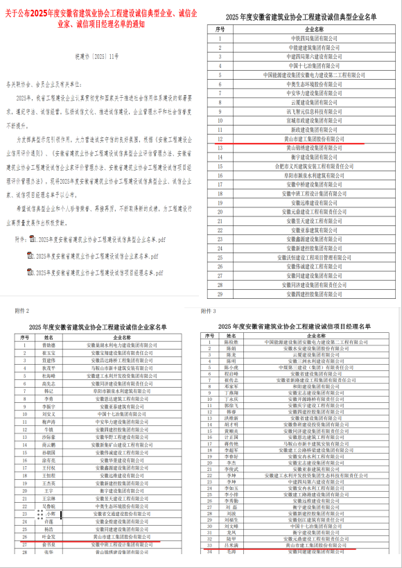近日,國(guó)家及省級(jí)行業(yè)協(xié)會(huì)相繼公布關(guān)于2025年度工程建設(shè)領(lǐng)域系列信用評(píng)價(jià)與先進(jìn)評(píng)選的結(jié)果,黃山市建工集團(tuán)股份有限公司憑借卓越的綜合實(shí)力、良好的市場(chǎng)信譽(yù)和穩(wěn)健的經(jīng)營(yíng)表現(xiàn),在多個(gè)權(quán)威評(píng)選中脫穎而出,收獲累累碩果,再次彰顯了公司在行業(yè)內(nèi)的領(lǐng)先地位與誠(chéng)信標(biāo)桿形象。